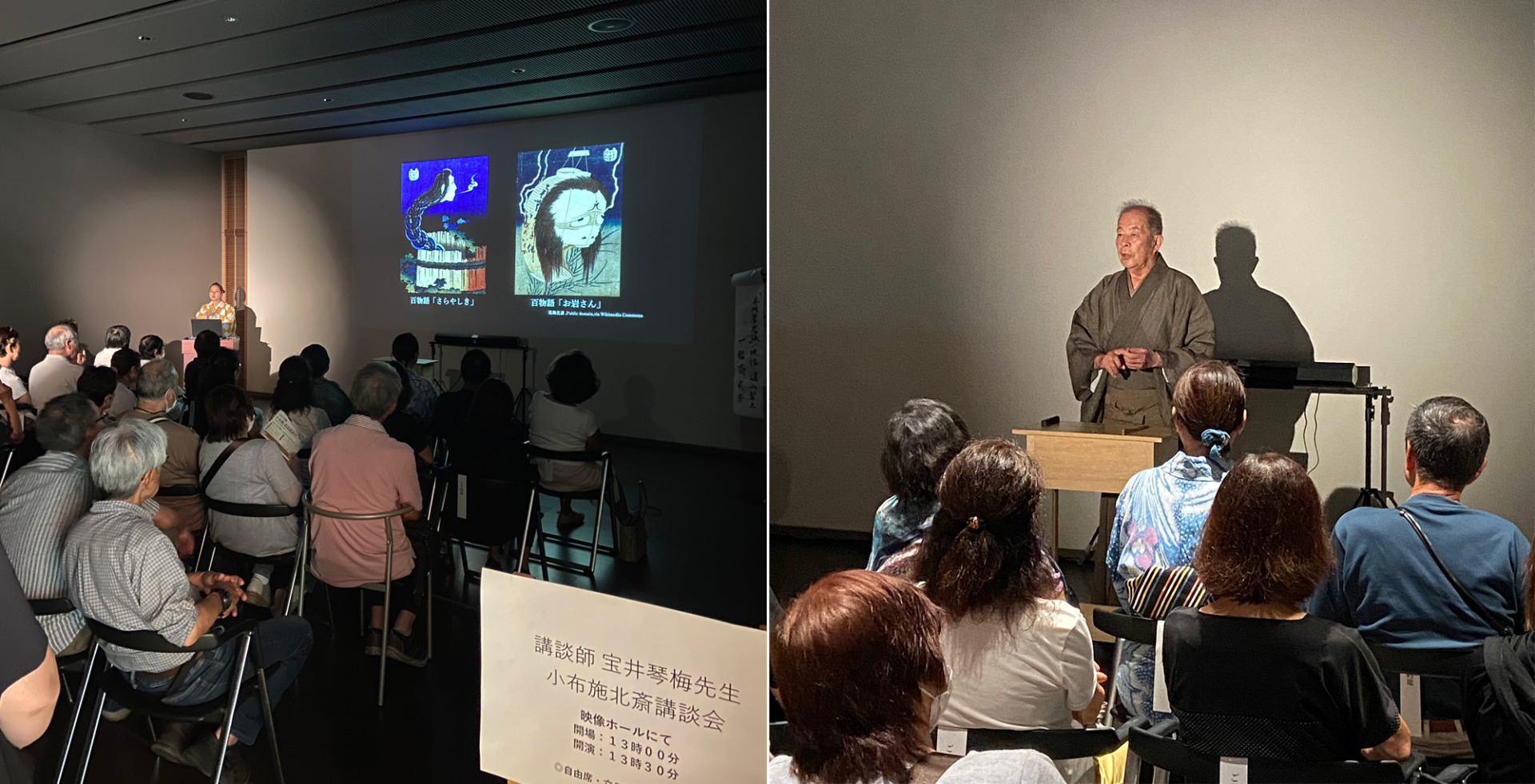 第1弾として開催した、「宝井琴梅 小布施 北斎講談会」。当日はご予約いただいたお客様に加え、ご来館中のお客様にもご興味を持っていただき、当日席、立見席も合わせて50名近いお客様が入り、大盛況となりました。小布施町 北斎館にまつわる宝井琴梅先生の「北斎と高井鴻山の出会い」を楽しみにしてお越しいただいた小布施町のお客様も多く、ご来場の皆様には、4名の講談師による、映像なども交えた様々な演目を楽しんでいただきました。