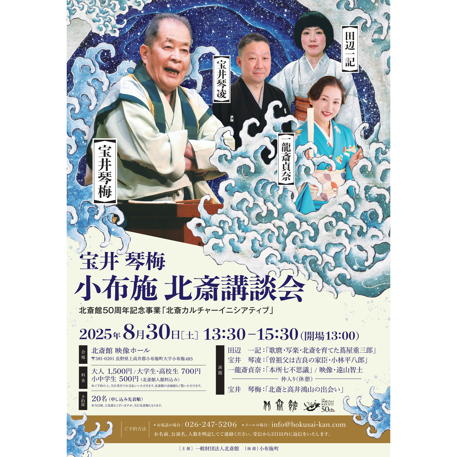 北斎館では、開館50周年に向けて、「北斎カルチャーイニシアティブ」という文化活動を立ち上げました。日頃から北斎館を支え、親しんでくださっている北信地域、小布施町の皆様に、「北斎の町 小布施」をもっともっと楽しんでもらいたいという想いで、今後継続して文化イベントを企画、開催してまいります。