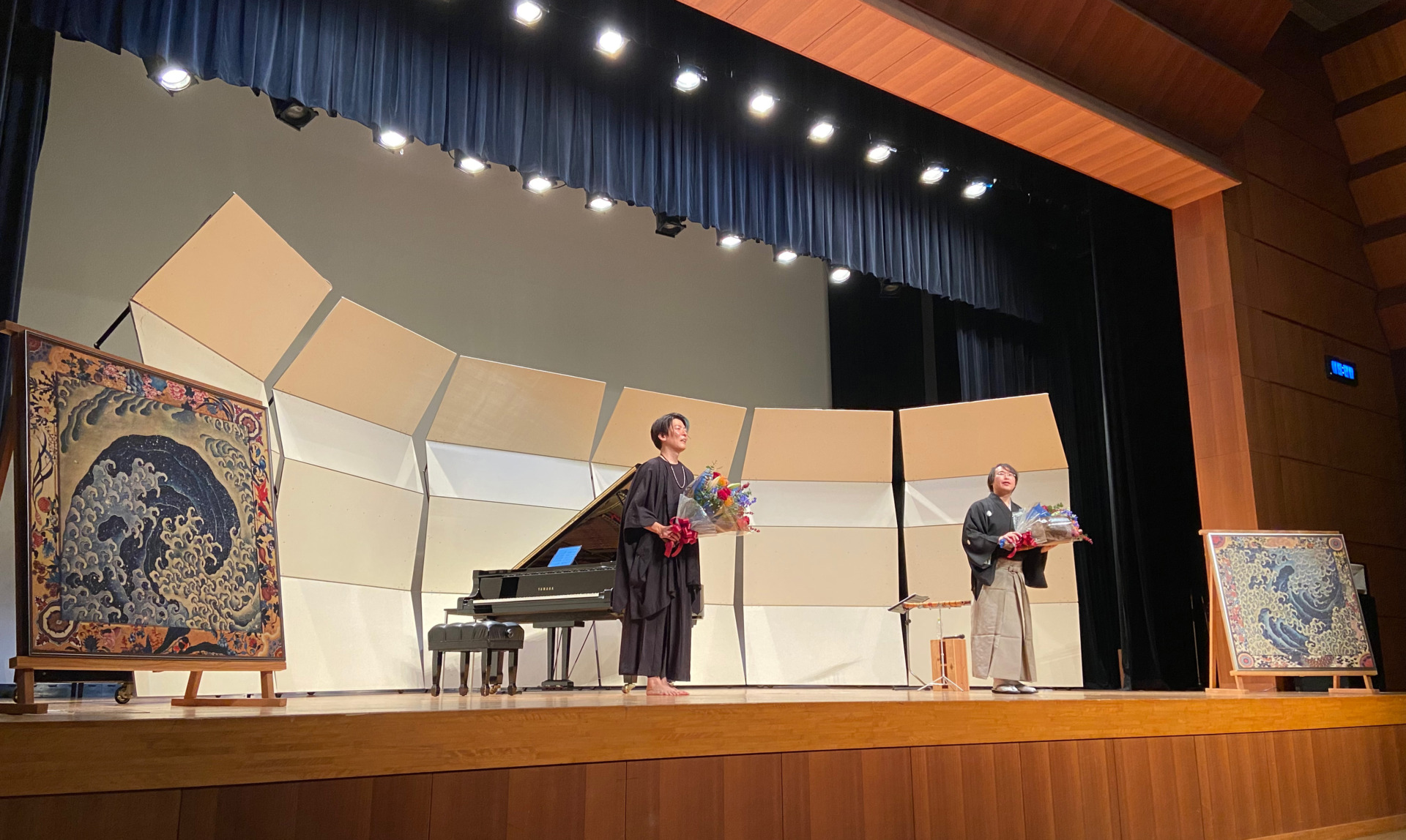 会場は小布施駅前の北斎ホール。北斎ホールの緞帳は北斎館所蔵の祭屋台天井画「男浪」、そして鳳凰図を描き出した大きな作品も飾られており、「北斎の町、小布施」を存分に楽しんでいただけるシチュエーションで、それぞれの領域での第一線で活躍する二人が、和洋の境を越えてぶつかり合う。様々な音色を紡ぎ出す黒田鈴尊さんの尺八と、クラシックからまるでJAZZピアノのようなリズム感のあるものまで、多彩な伊藤優來さんのピアノに歓声が上がり、会場は盛り上がりました。