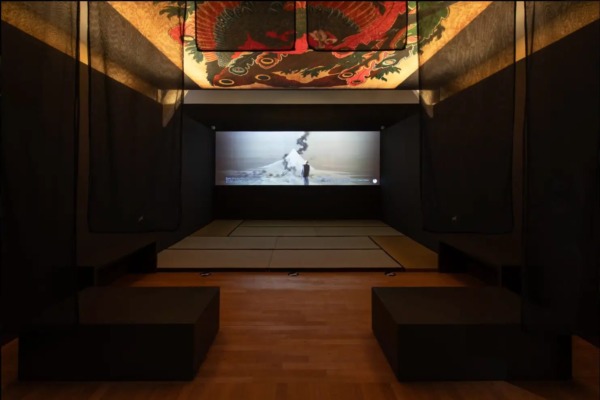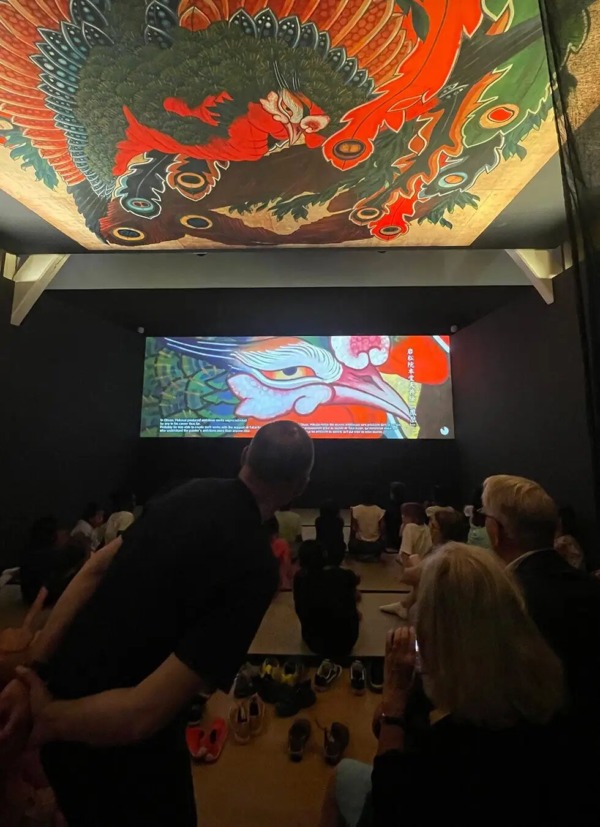『岩松院八方睨み鳳凰図(複製)』の下で、映像「小布施と北斎」を楽しめる畳敷きの映像ルーム。鳳凰図にはNTT ArtTechnology/アルステクネによる超高精細画像が活用されている。